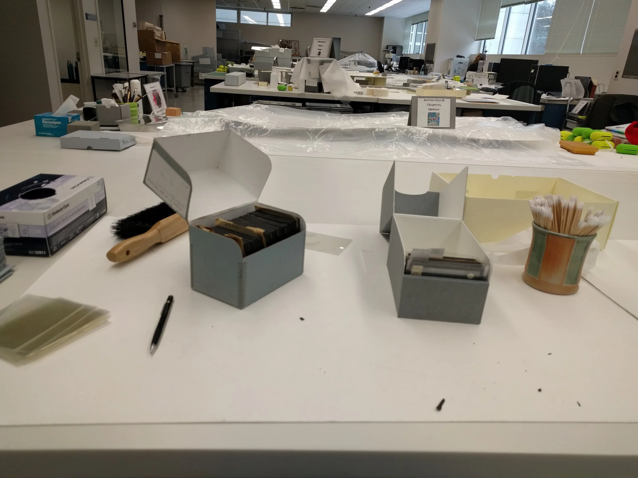 Another student and I were tasked with transferring lantern slides featuring Orville and Wilbur Wright’s early exploration to archival housing and assessing further conservation needs for the collection. Implementation of archival housing included taping the edges of slides, sleeving them, and organizing the collection into archival boxes.